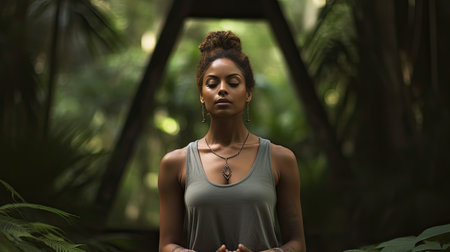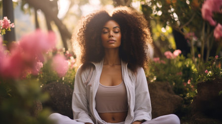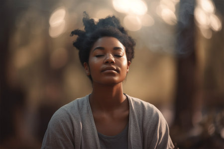 Young african american woman meditate outdoors in the park in the shade of trees. Generative AI