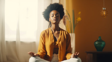 Smiling Black woman sitting in living room with eyes closed and meditating in lotus position