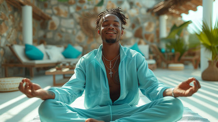 Man Meditating in Blue Outfit on Outdoor Patio