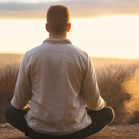 Young man meditating in nature finding inner peace and mindfulness