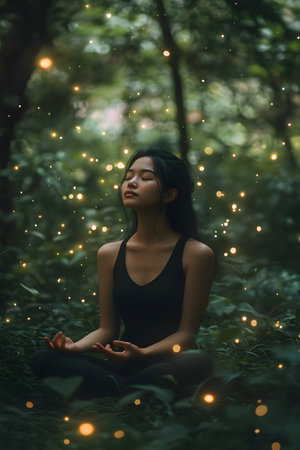 Serene woman sitting in a meditative pose,immersed in the tranquility of a lush forest,surrounded by the ethereal glow of fireflies,capturing a moment of mental health,calm,and peaceful self-care.