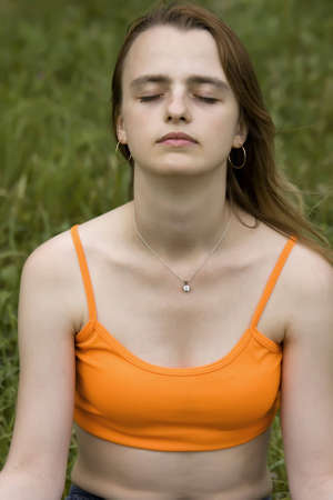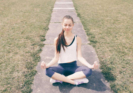 The meditating girl engaged in park yoga