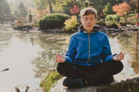 Teenage boy meditating and relaxing in a city park japanese garden. teen boy in a lotus position meditating, outdoor meditation on a stone on a pond shore