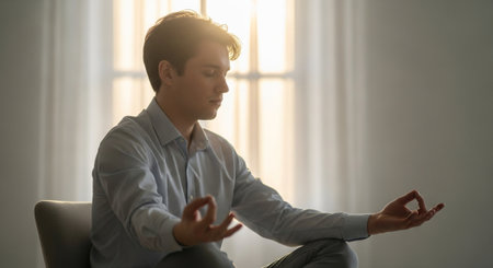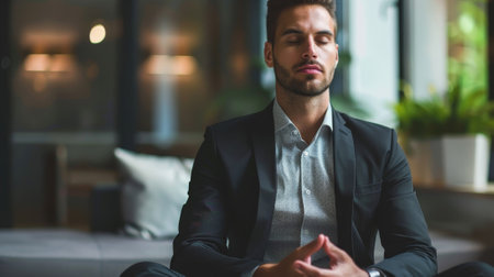 A man in a suit is sitting on a couch and meditating. Concept of calm and relaxation, as the man is focused on his breathing and inner thoughts. The setting of the image, with the couch