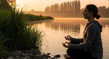 A peaceful woman practices meditation in a lotus pose by a tranquil lake at sunrise. The serene natural setting with water and trees enhances the atmosphere of mindfulness and spiritual wellness.