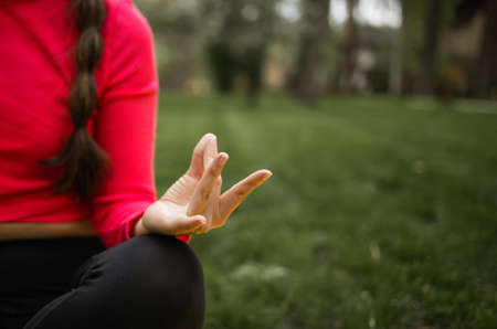 Crop photo of female hands, meditation, zen. Young woman meditates in the forest while sitting on the mat. Harmony