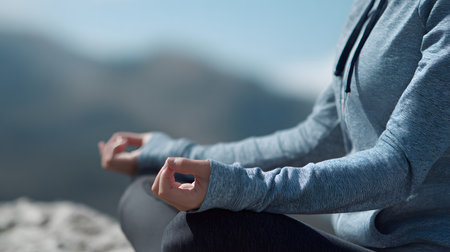 fingers folded in mudra against the background of mountains and fog, a state of peace and tranquility, Zen, yoga in nature