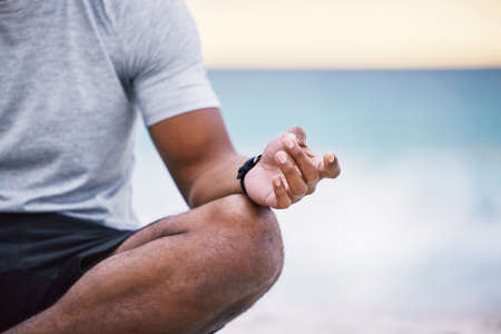 Finding balance. an unrecognizable male athlete meditating on the beach.