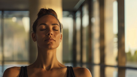 Serene woman with closed eyes relaxing in warm natural light indoors