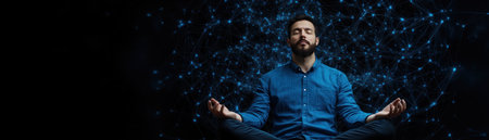 Find inner peace with a serene figure meditating in an abstract galaxy This tranquil scene embodies mindfulness, spirituality, and cosmic awareness, merging inner calm with the universe's vastness Experience the profound connection between self and cosmos in a moment of pure, unburdened consciousness, ideal for meditation AI Generative