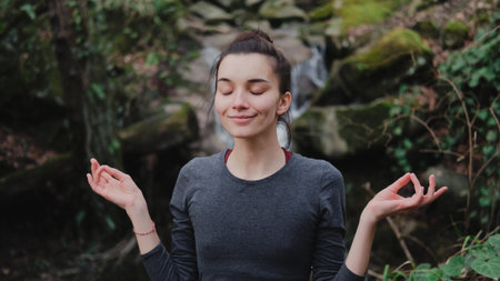 Young woman practicing breathing yoga pranayama outdoors in moss forest on background of waterfall. Unity with nature concept