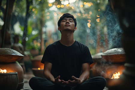 A Southeast Asian man meditating in a peaceful, contemplative pose.