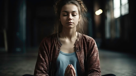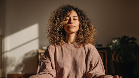 A person sits cross-legged in a quiet space, eyes closed and face relaxed, engaging in meditation during a serene moment of reflection in soft light.
