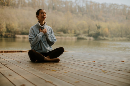A Korean woman sits peacefully by the river, practicing mindfulness meditation surrounded by beautiful autumn scenery.