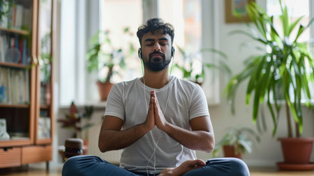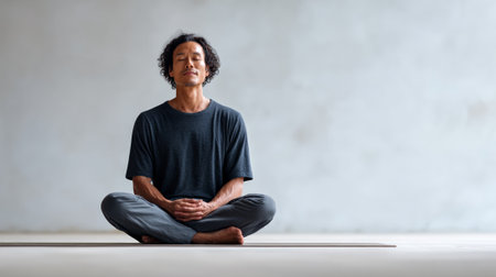 Asian man practicing meditation on a yoga mat in a bright room, finding inner peace and mindfulness through calming breathwork and mindful presence