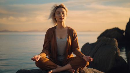 Young woman 20-25 sitting and meditating environment yoga meditation in a modern, warm, outdoor