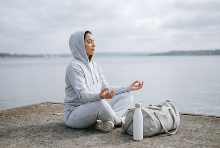Beautiful girl in sportswear sitting on pier and meditating.