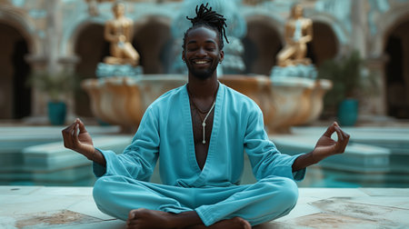 Man Meditating in Blue Outfit on Outdoor Patio