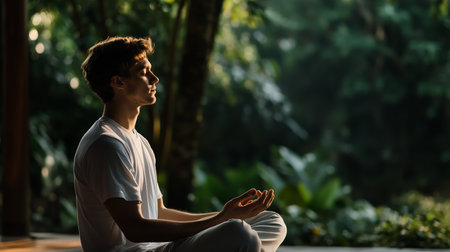 Young man meditating quietly in lush forest surroundings during early morning light for a peaceful mind
