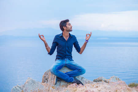 Man in yoga meditation pose sitting on a rock stone shore above the sea taking deep breath relaxing at sunset blue sky and sea on background. Find harmony and balance enjoying freedom, nature concept