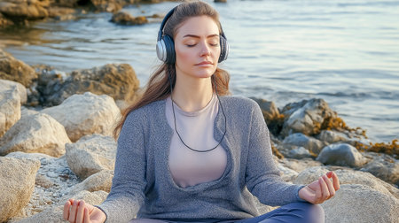 A young woman meditates on a rocky beach with headphones, embodying calmness