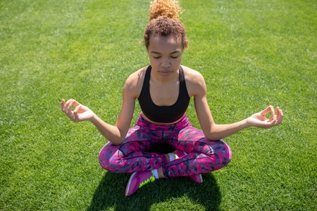 Relaxed fit black girl in sportswear sitting with legs crossed on green meadow in park and meditating with eyes closed.