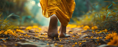 Detail of religious figure walking barefoot along a rural path. Concept Religious Figure, Walking Barefoot, Rural Path, Spiritual Journey