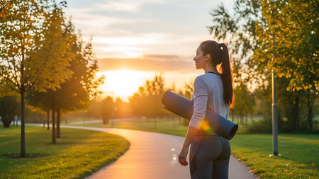 Young woman with yoga mat in the park at sunset. Healthy lifestyle concept.