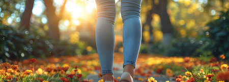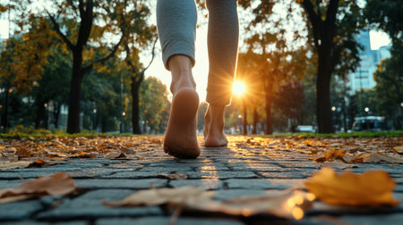 A person is walking barefoot on a path in a park. The sun is shining brightly, casting a warm glow on the leaves and the ground. The scene is peaceful and serene