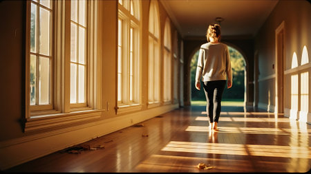 A woman is seen running on a wooden path through a misty meadow at sunrise. The scene is bathed in golden sunlight, creating a peaceful and serene atmosphere. It evokes a sense of well-being, fitness, and a connection with nature.