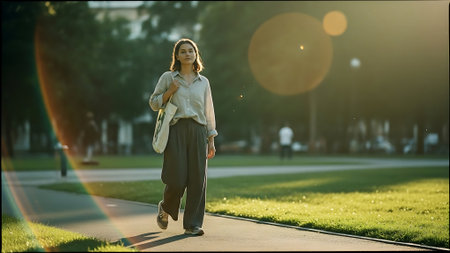 Beautiful young woman walking in the park. Sunset light and lens flare.