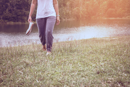 Close up woman walk in to the wild. Travel adventure and freedom concept. Vintage tone filter effect.