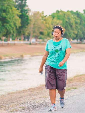 KANCHANABURI/THAILAND-MAY 7,2020 : Unidentified Thai sportive woman with headphone jogging for good health on road beside irrigation canal at Mae Klong Dam on may 7,2020 in Kanchanaburi, Thailand.