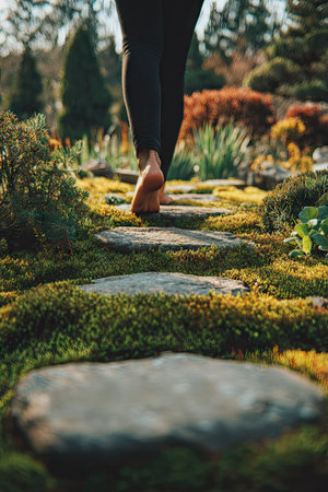 A person is walking barefoot on stepping stones through a garden. The scene features lush green moss and foliage, with a blurred background of trees and shrubs. The natural lighting and perspective create a sense of depth. Suitable for editorial or commercial content related to nature and lifestyle.