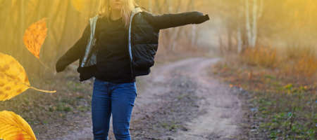 Woman walking in autumn forest with yellow leaves. Selective focus.