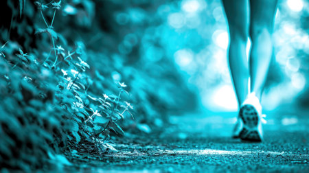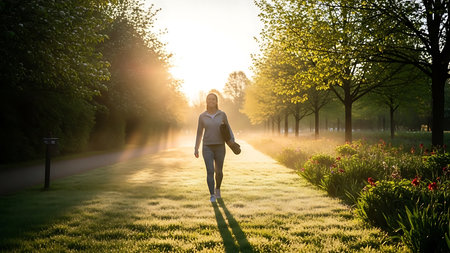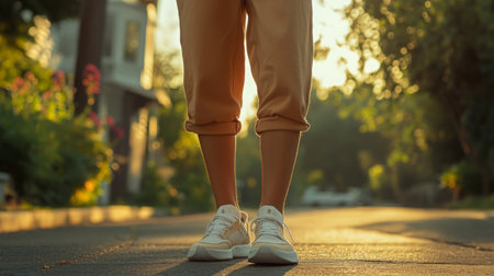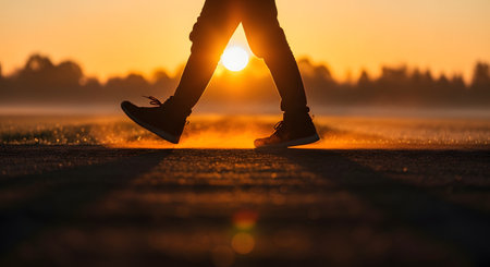 A low-angle shot capturing the silhouette of a person's legs walking briskly along a paved path during a vibrant golden sunrise. Dust particles float in the warm backlighting while the subject wears sneakers, symbolizing an active morning routine and determination.