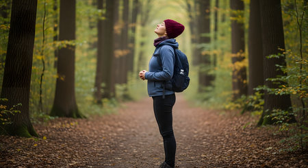 A female hiker with a backpack standing on a forest path covered in autumn leaves, taking a deep breath with eyes closed. She is wearing a blue fleece and red beanie, enjoying the fresh air and tranquility of the woods.