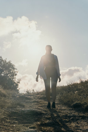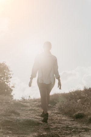 Woman Freedom Happiness - Backlit silhouette of a woman with arms outstretched walking on a trail.