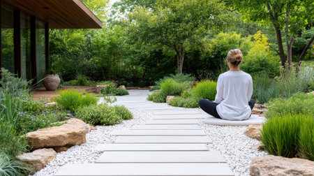 A peaceful Zen garden with person practicing Tai Chi, surrounded by nature