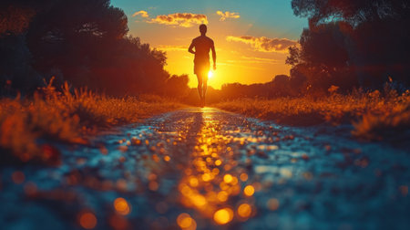 Athlete running on a country road at sunset. Healthy lifestyle concept.