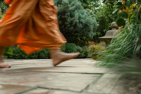 A monk in orange walking on a path in a garden. The person is barefoot and he is in a relaxed state