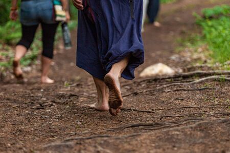 Diverse people enjoy spiritual gathering A close up view on the bare feet, covered in mud and dirt, as they walk on sacred soil during a spiritual exercise in woodland.