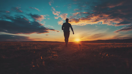 A figure strides confidently across a wide, open field as the sun sets, casting warm hues across the sky and illuminating the landscape with golden light.