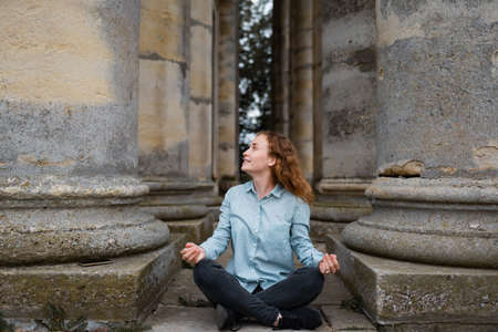 A girl relaxing and meditating between ancient pillars.