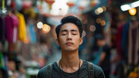 Young man engages in mindfulness and relaxation exercises, standing outdoors with eyes closed. Captures peaceful moments of meditation and wellness, highlighting focus on breathing