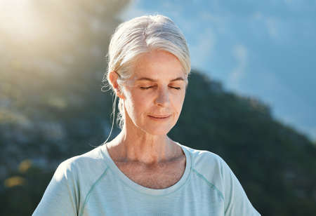 Senior woman with grey hair standing outside with her eyes closed and breathing deeply, meditating in nature. Finding inner peace, balance and living healthy