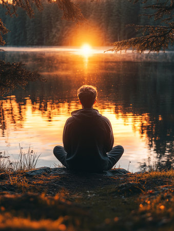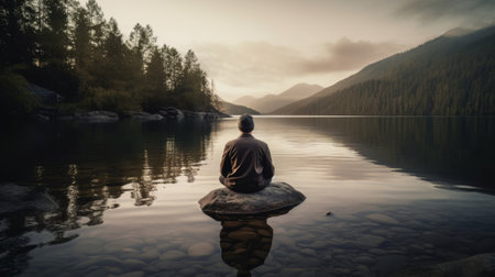 Man meditating on a rock by a calm lake during sunrise, enjoying the peace and quiet of nature