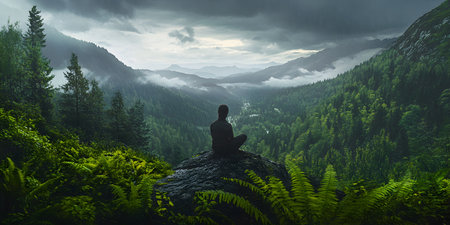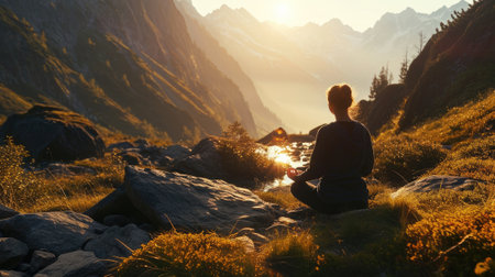 Serene man meditates in tranquil mountain landscape, finding solitude and well-being generated by artificial intelligence