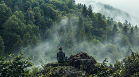 Person sitting on rock overlooking misty forest