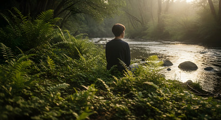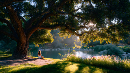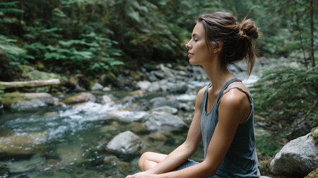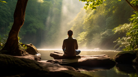 A person sitting peacefully by a flowing river in a lush green forest, practicing meditation or mindfulness. The morning sunlight filters through the trees, creating a calm and restorative atmosphere.
